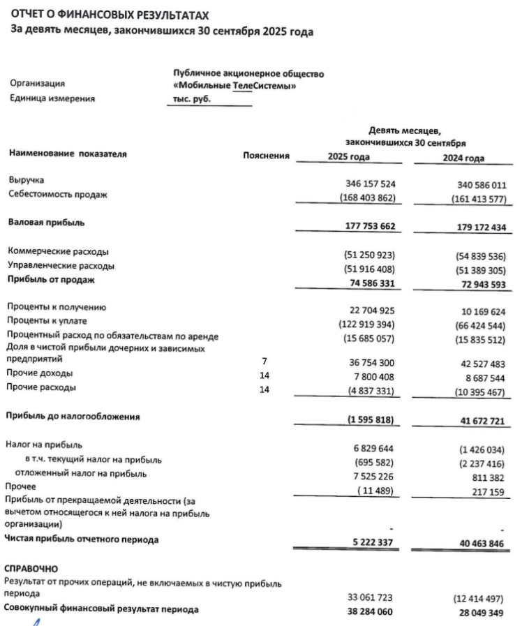 МТС РСБУ 9 мес 2025г: выручка ₽346,15 млрд (+1,6% г/г), чистая прибыль ₽5,22 млрд (снижение в 7,7 раза г/г)